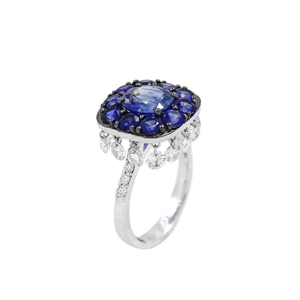 Blue sapphire cushion shaped ring with round brilliant dancing diamonds hanging freely on the edges set in 18K black and white gold.