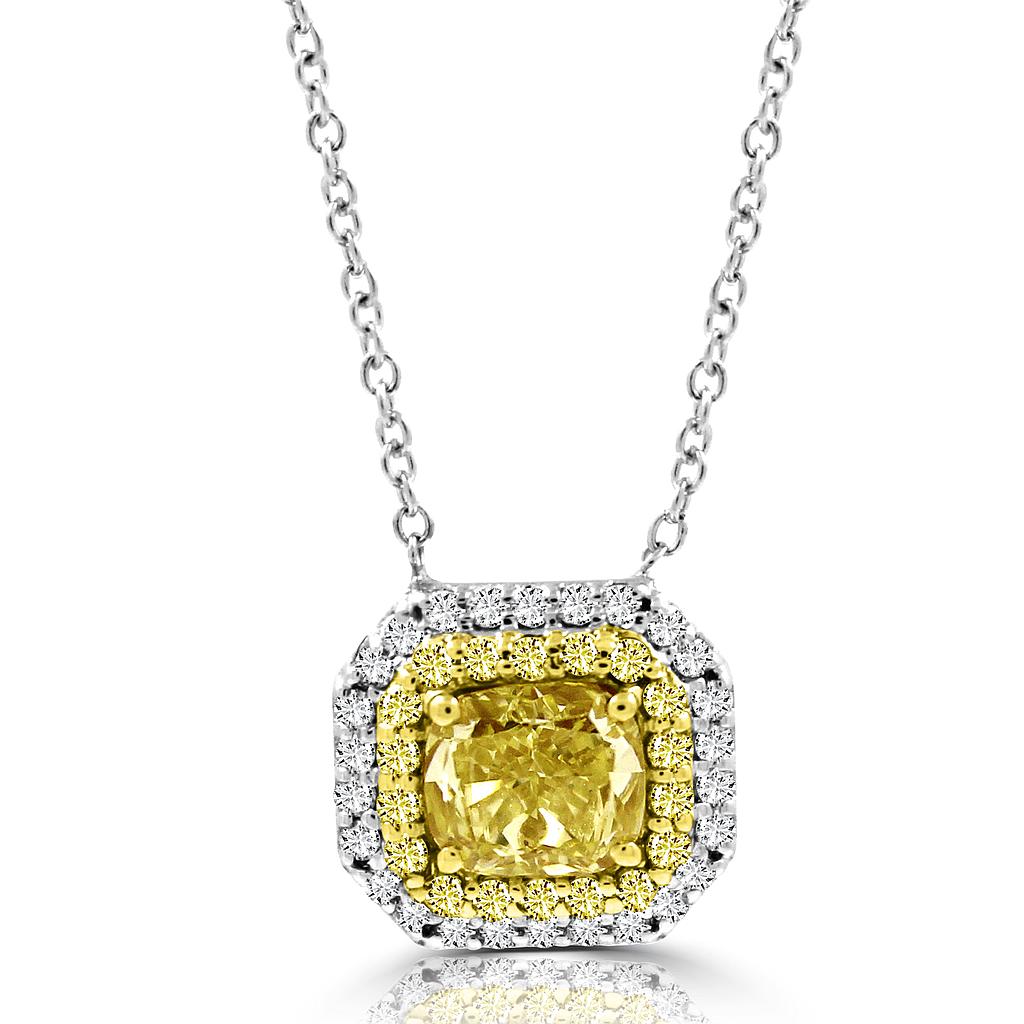 Pendant necklace with cushion yellow diamond with a halo of natural yellow and white diamond melees suspended on chain with two double drilled diamond briolette and a single drilled diamond briolette hanging at the end, set in 18k gold.