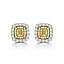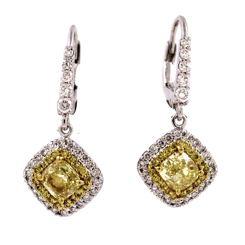 Stylish drop earrings are fashionably pleasing with centerpieces asthetically matched for color and clarity. Classy and modern, these dangling earrings showcase a exquisite set of cushion cut diamond centers (combined weight of 1.16 carats). The center yellow diamonds are styled by an architectural double halo of pave-set diamonds for that extra sparkle. The 18k yellow and white gold earrings has a diamond studded lever-back hook. The weight of center and other diamonds are approximate and may vary slightly. For more information please contact via email or phone. SKU: ER6X352.