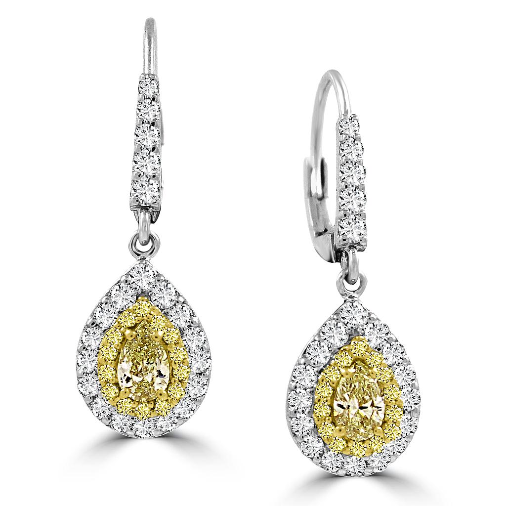 Pear Shape Yellow Diamond Dangle Earrings with a halo of Natural Yellow and White Diamond melees and on a lever back studded with White Diamonds set in 18k gold