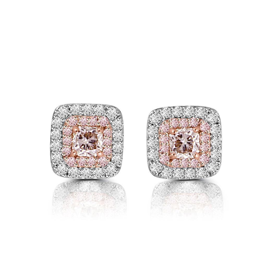 Pink diamond earrings with halo of natural pink and white diamond melees set in 18k white gold