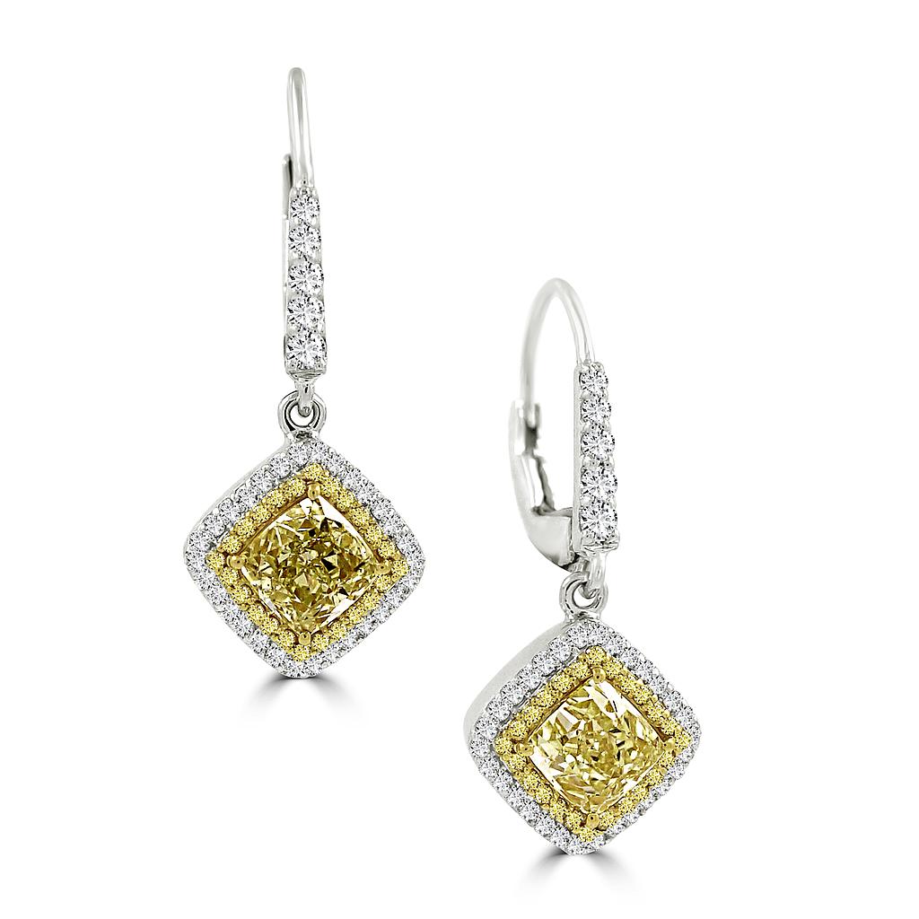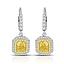 Square Yellow Diamond Dangle Earrings with a halo of Natural Yellow and White Diamond melees and on a lever back studded with White Diamonds set in 18k gold