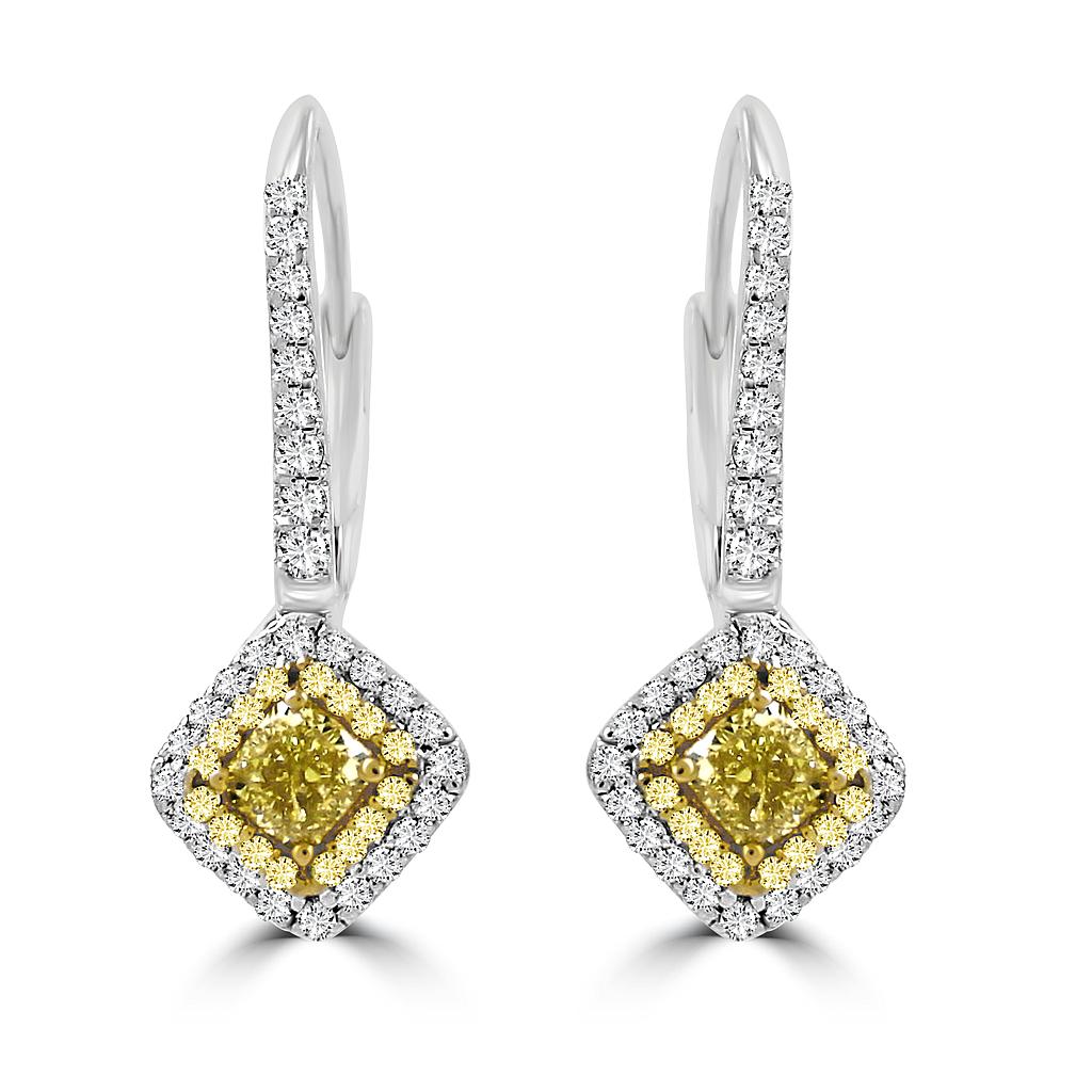 Square yellow diamond with a halo of natural yellow and white diamond melees drop earrings set in 18 karat white gold.