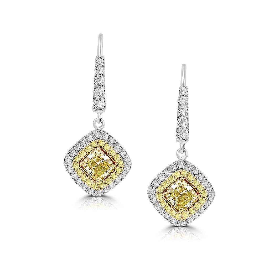 Yellow Cushion Diamond Dangle Earrings accented with Natural Yellow and White Diamonds with 1.64cts. total Diamond weight set in 18k gold