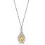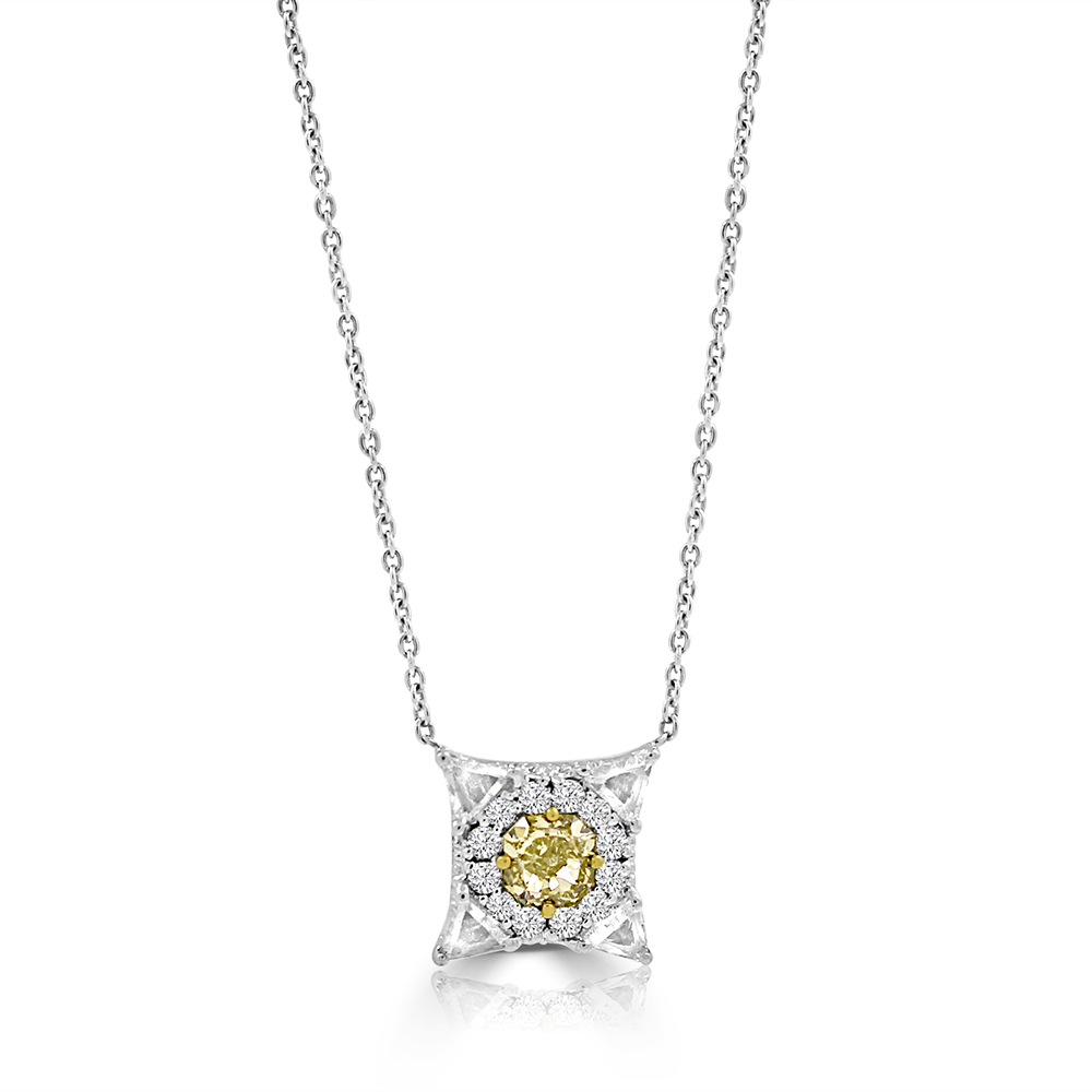 Pendant necklace features a yellow cushion diamond surrounded with halo of white melee diamonds and rose cute on 4 sides set in 18 karat white Gold.