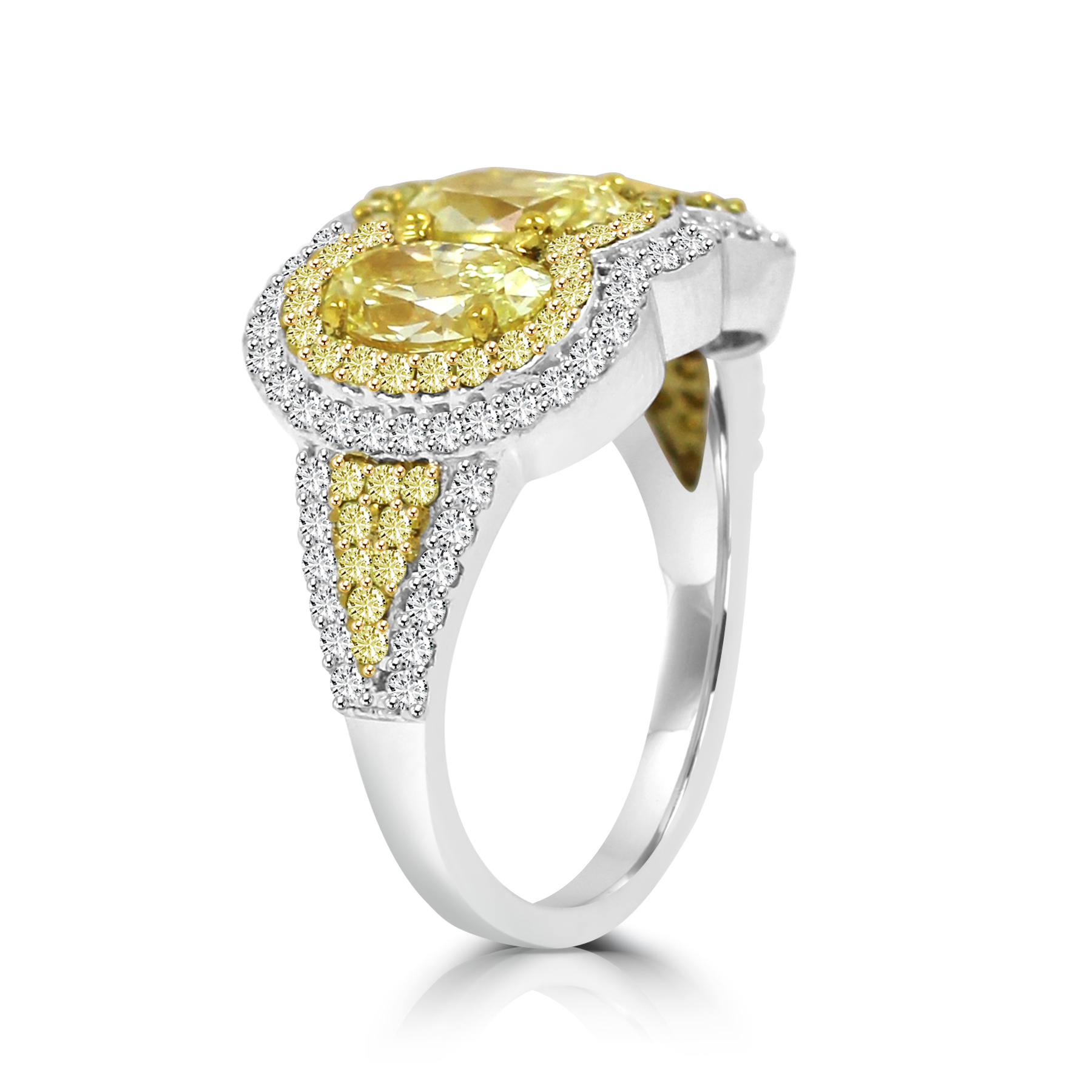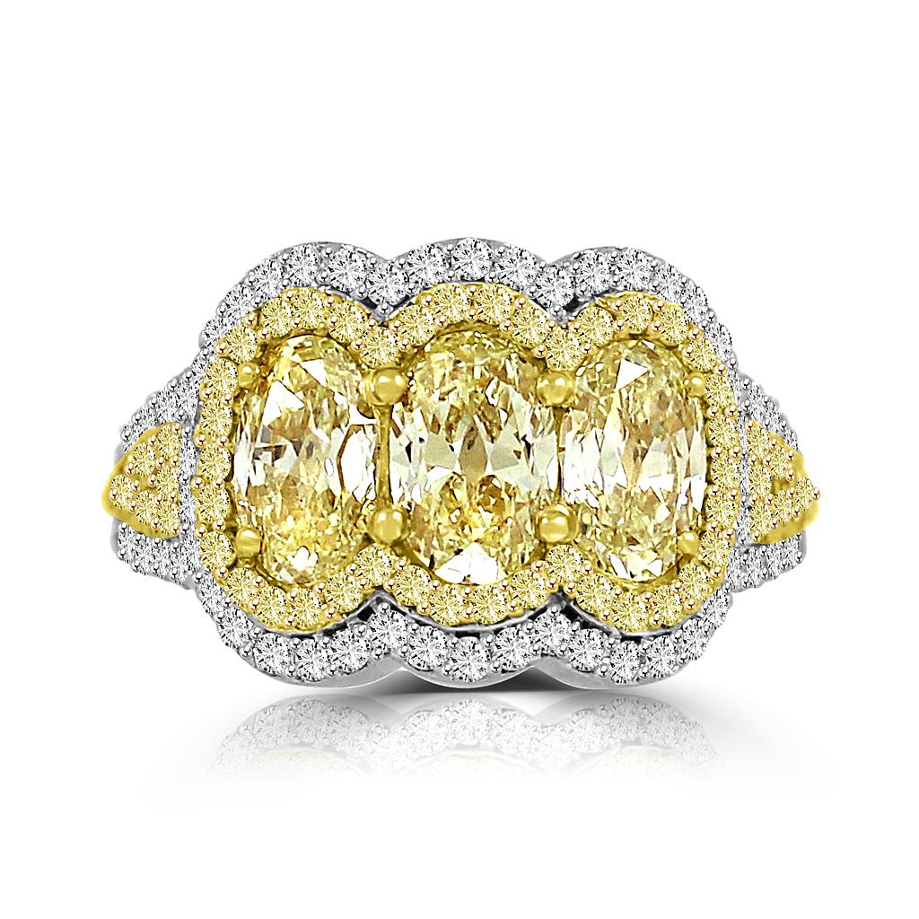 Ring featuring three Oval Yellow Diamonds surrounded with Natural Yellow and White Diamond Melees set in 18k gold